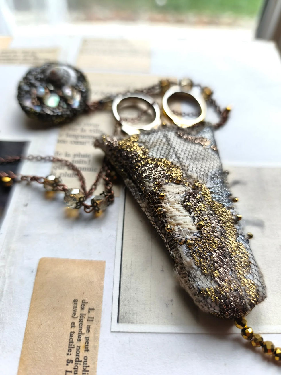 Chaque bijou est un palimpseste, un parallèle à "La Recherche", extraits d'images du passé, de réalités revisitées. Les couleurs fanées sont réchauffées par des éclats d’or vieilli, les broderies de perles tracent des chemins comme des racines anciennes qui remontent à la surface pour raconter leur histoire.
